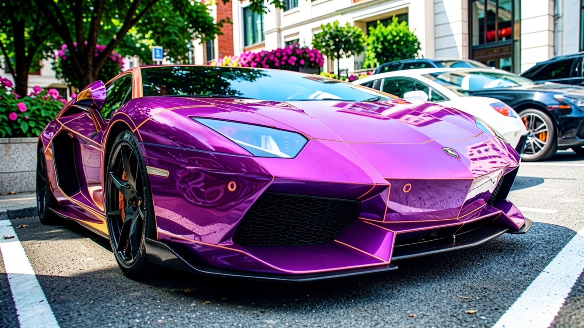 Фиолетовый суперкар Lamborghini Aventador на городской улице