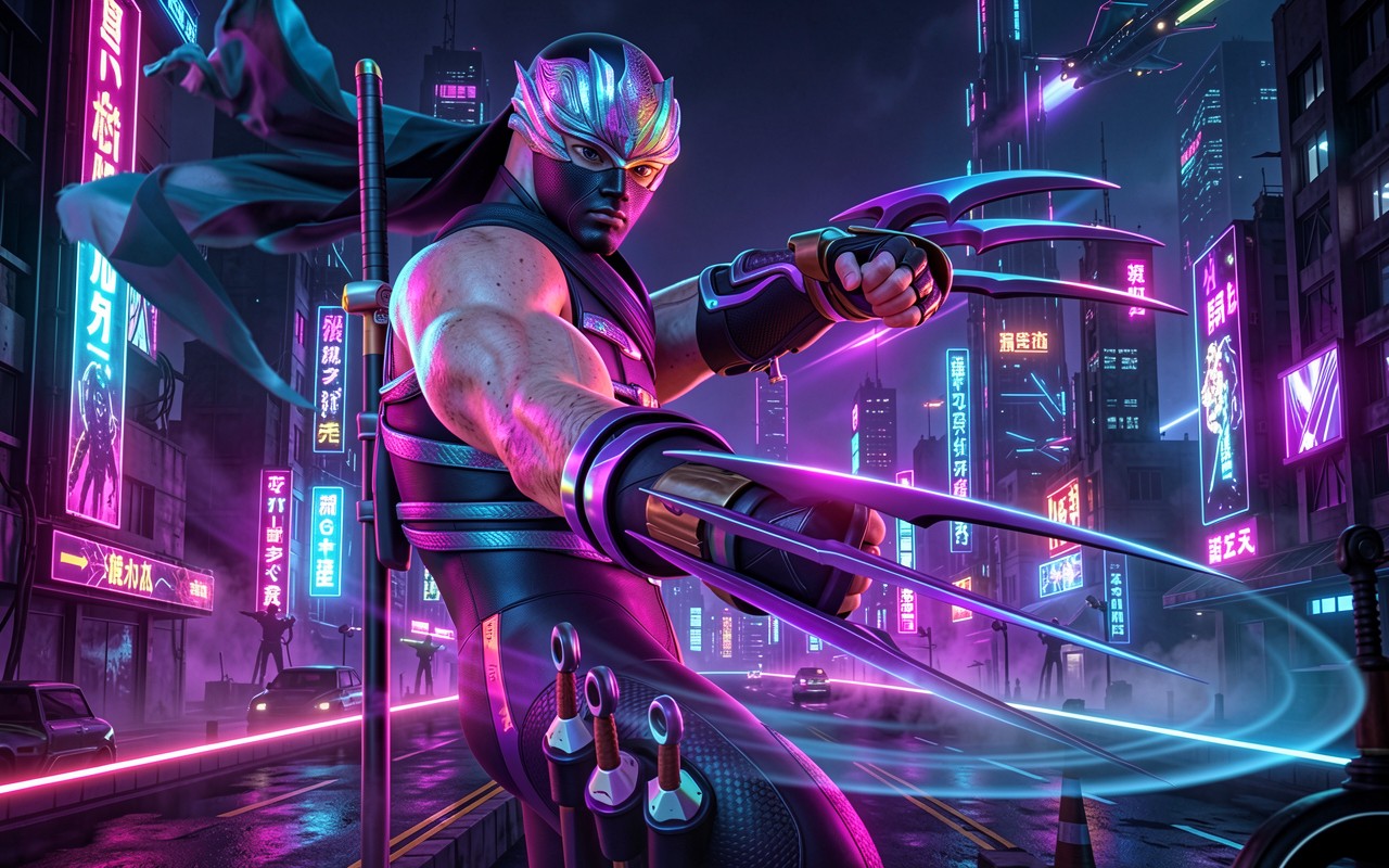 Росомаха в неоновом городе киберпанк фиолетовый стиль