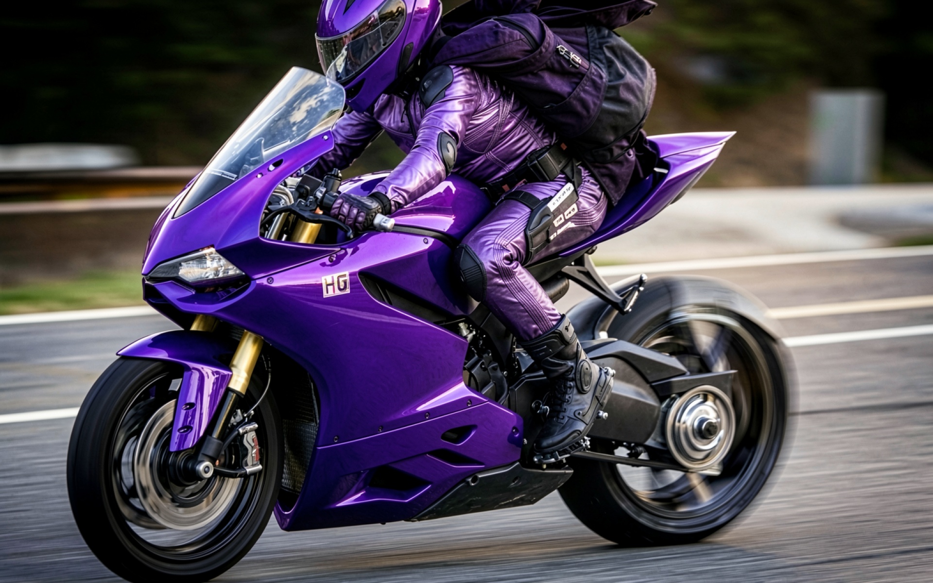Фиолетовый спортивный мотоцикл на скоростном шоссе