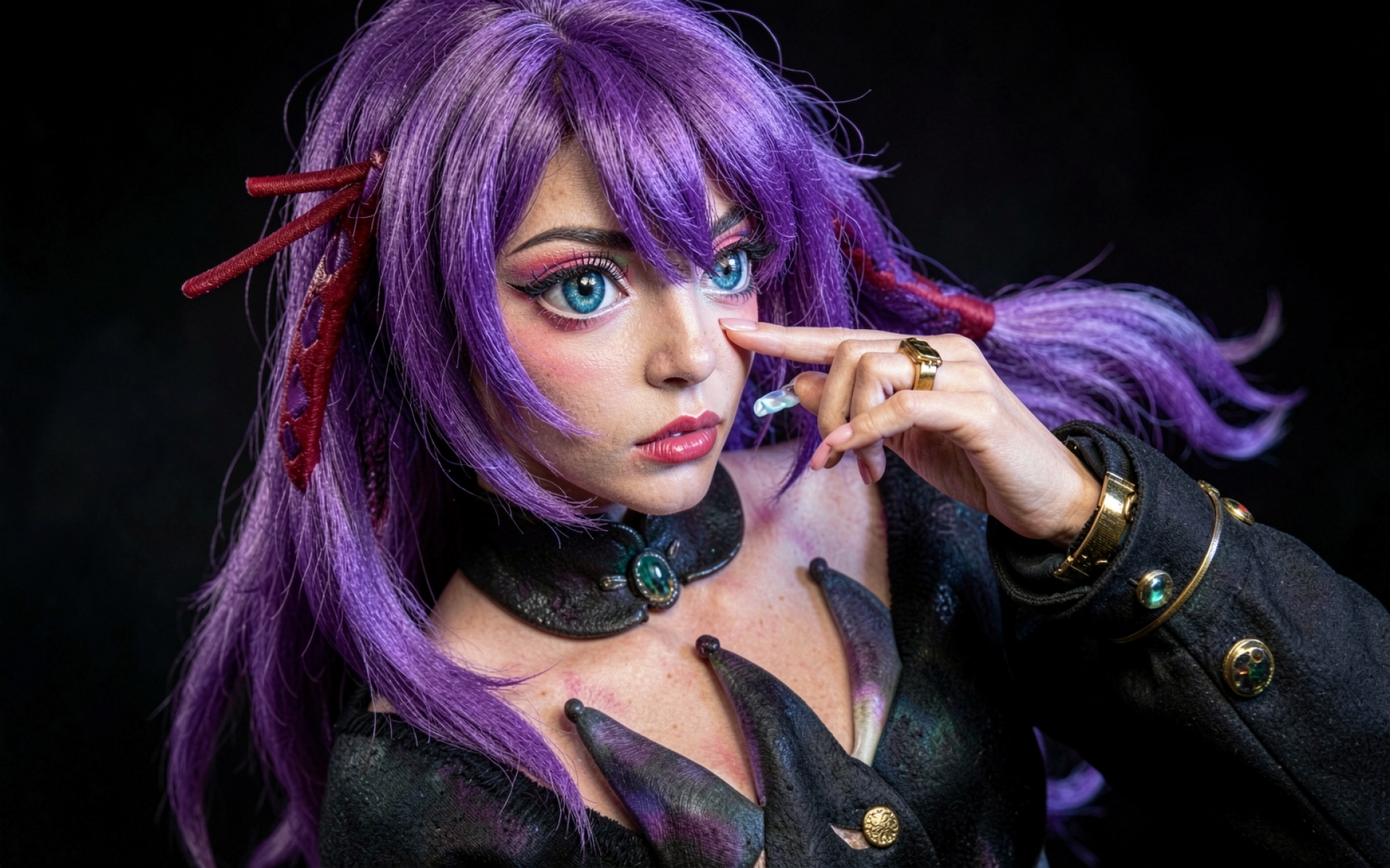Косплей девушки с фиолетовыми волосами темный фон