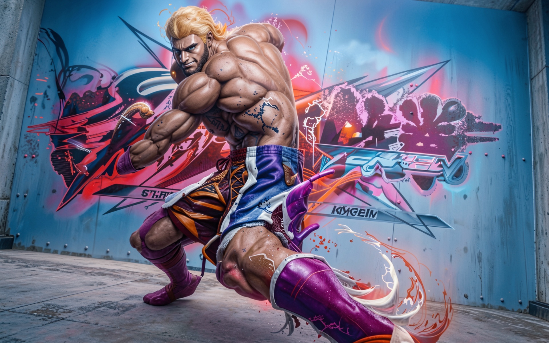 Боец в фиолетовых шортах на фоне граффити