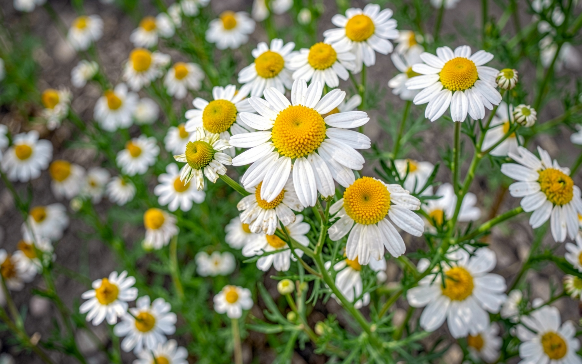 Белые ромашки с желтой сердцевиной на фоне земли