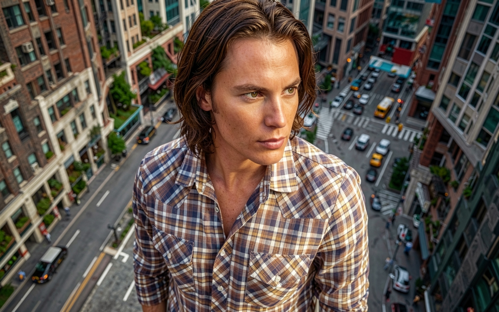 Мужчина в клетчатой рубашке на фоне Нью-Йорка