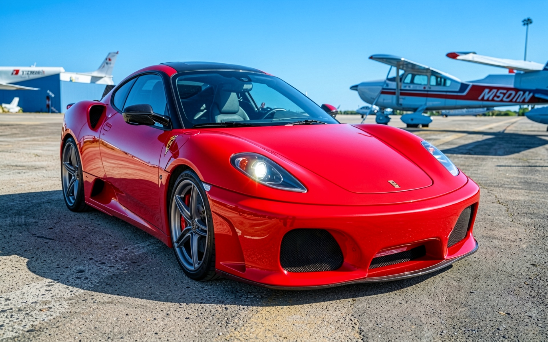 Красный спорткар Ferrari на фоне аэродрома