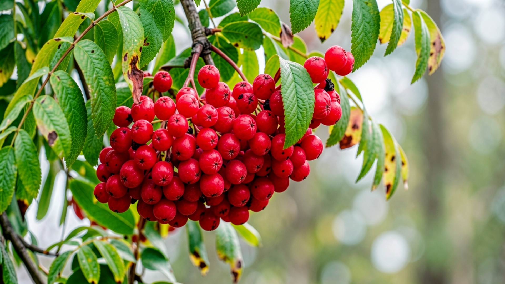 Гроздь красных ягод рябины на фоне листвы