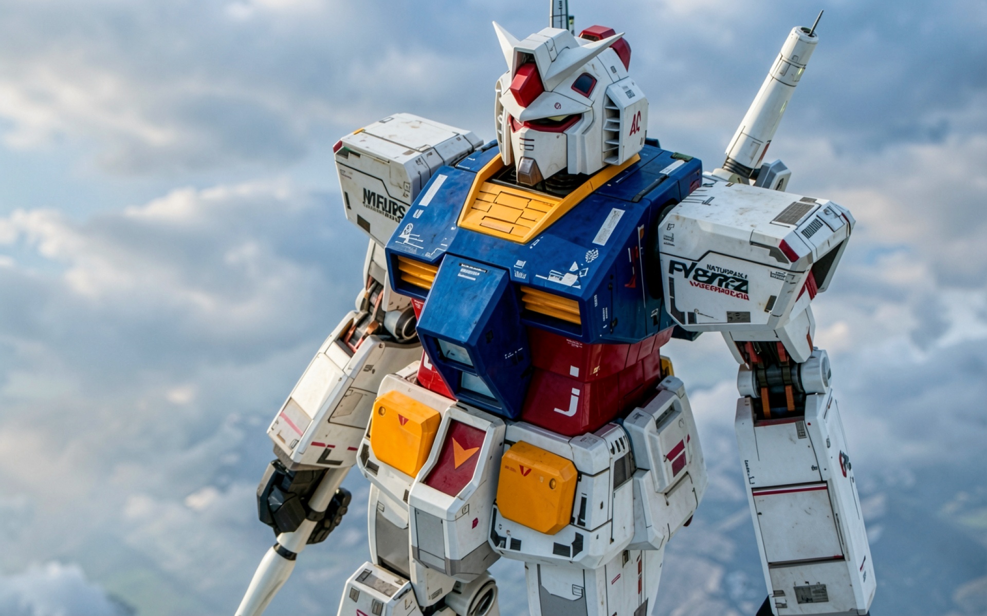 Робот Гандам в белом синем цвете на фоне облаков