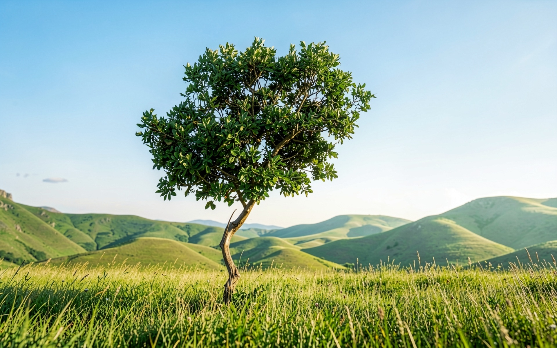Одинокое зеленое дерево на фоне холмов