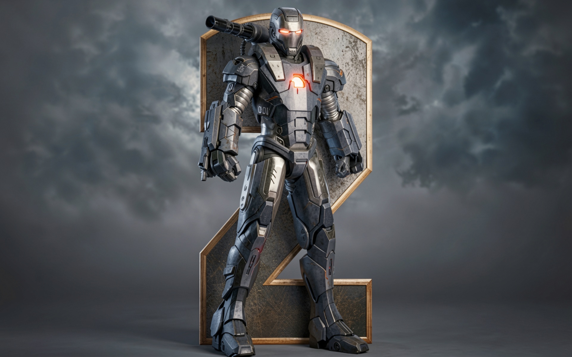 Железный человек в серой броне на фоне цифры два
