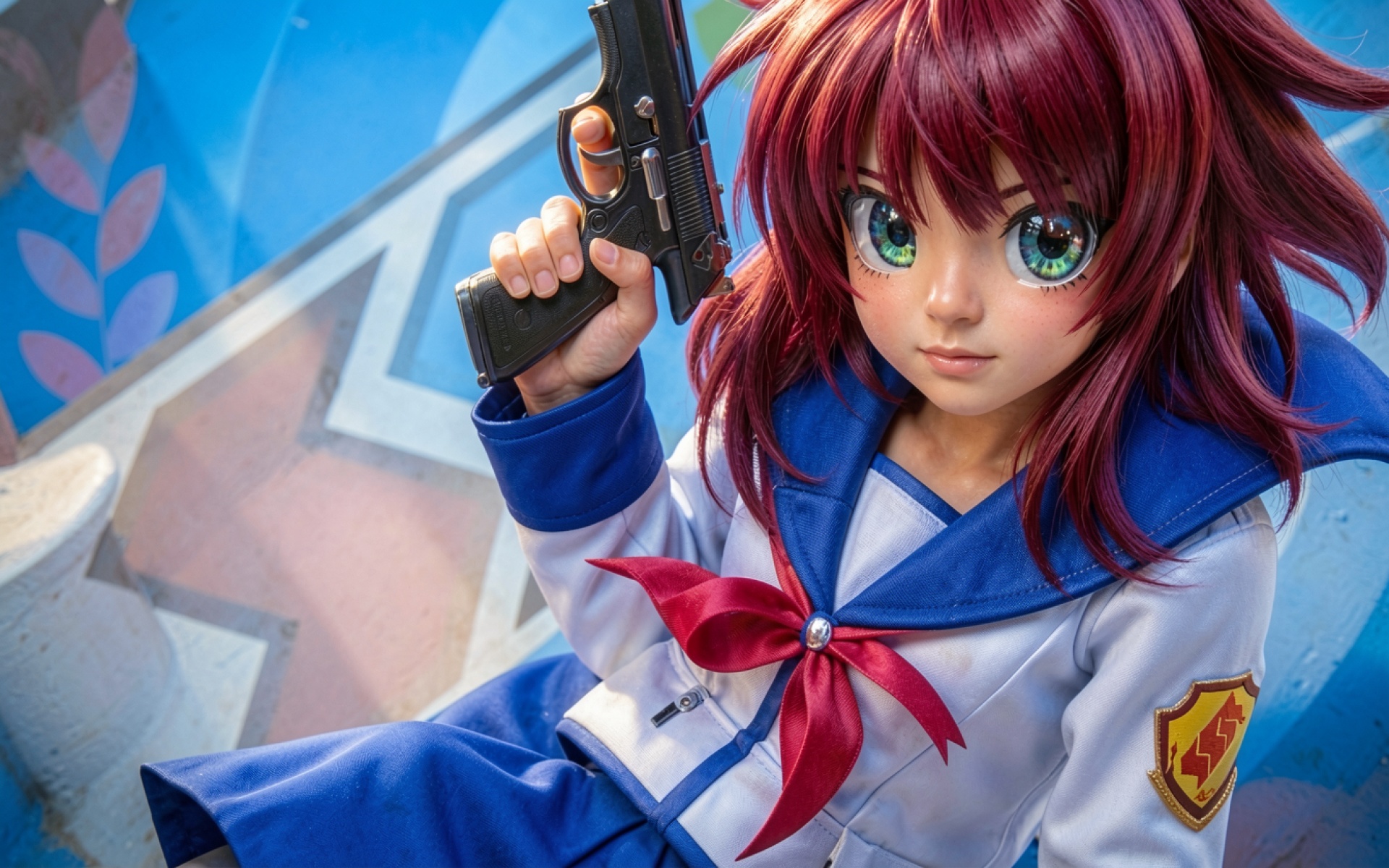 Девушка с красными волосами и пистолетом в форме