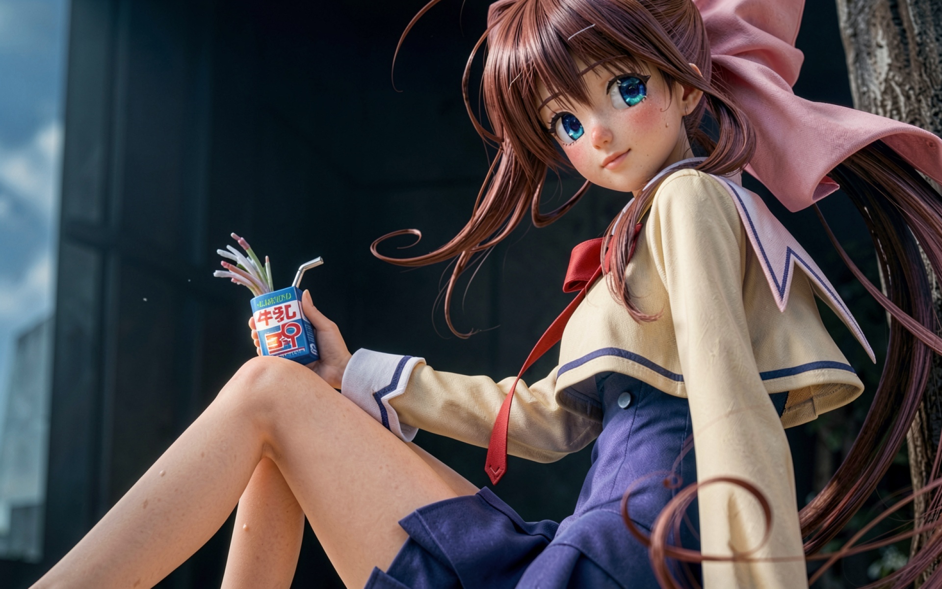Аниме девушка в школьной форме с напитком