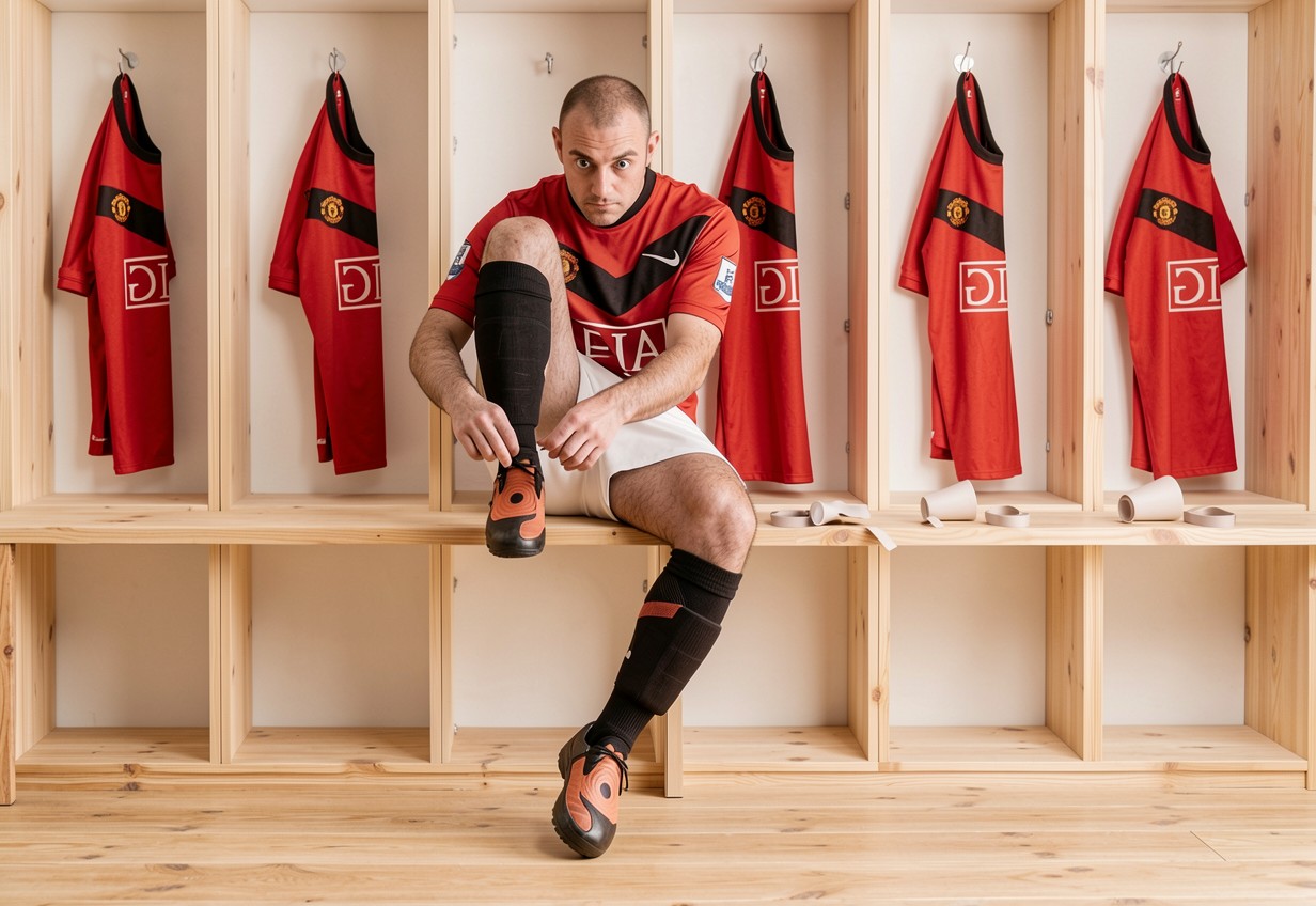 Футболист в красной форме в раздевалке