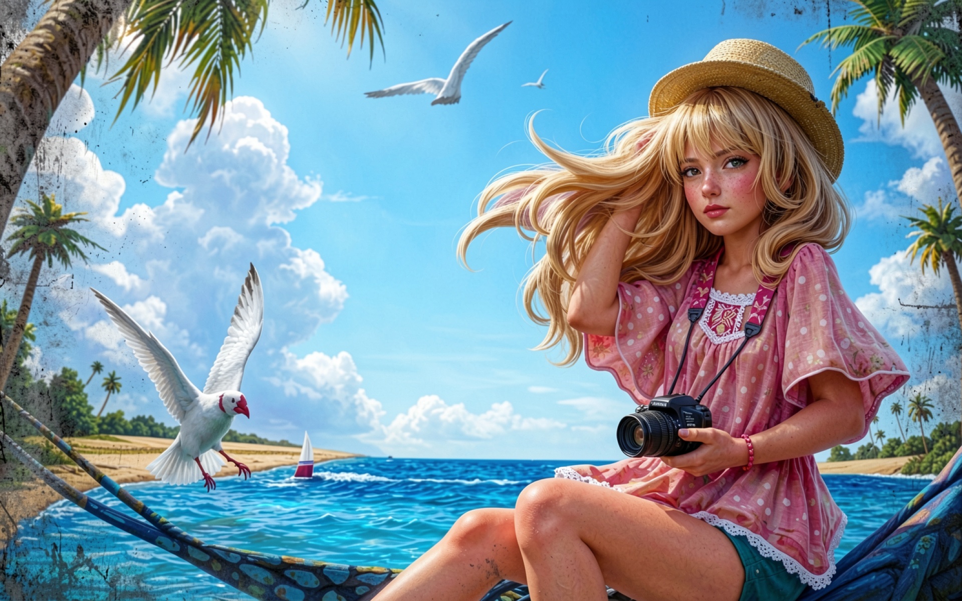 Девушка с фотоаппаратом на тропическом пляже