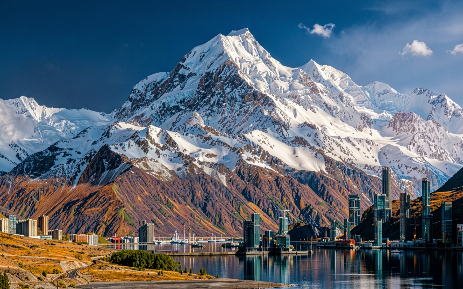 Снежные горы и футуристический город у воды