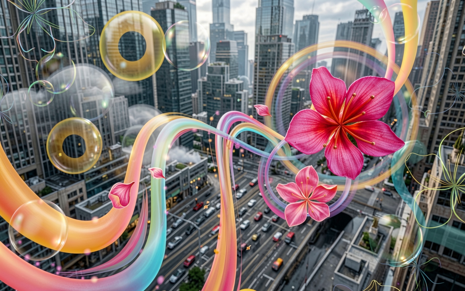 Розовые лилии в футуристическом городском пейзаже