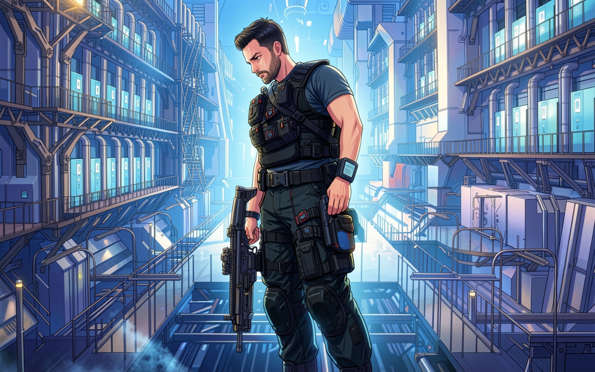 Боец в тактическом снаряжении в футуристическом городе