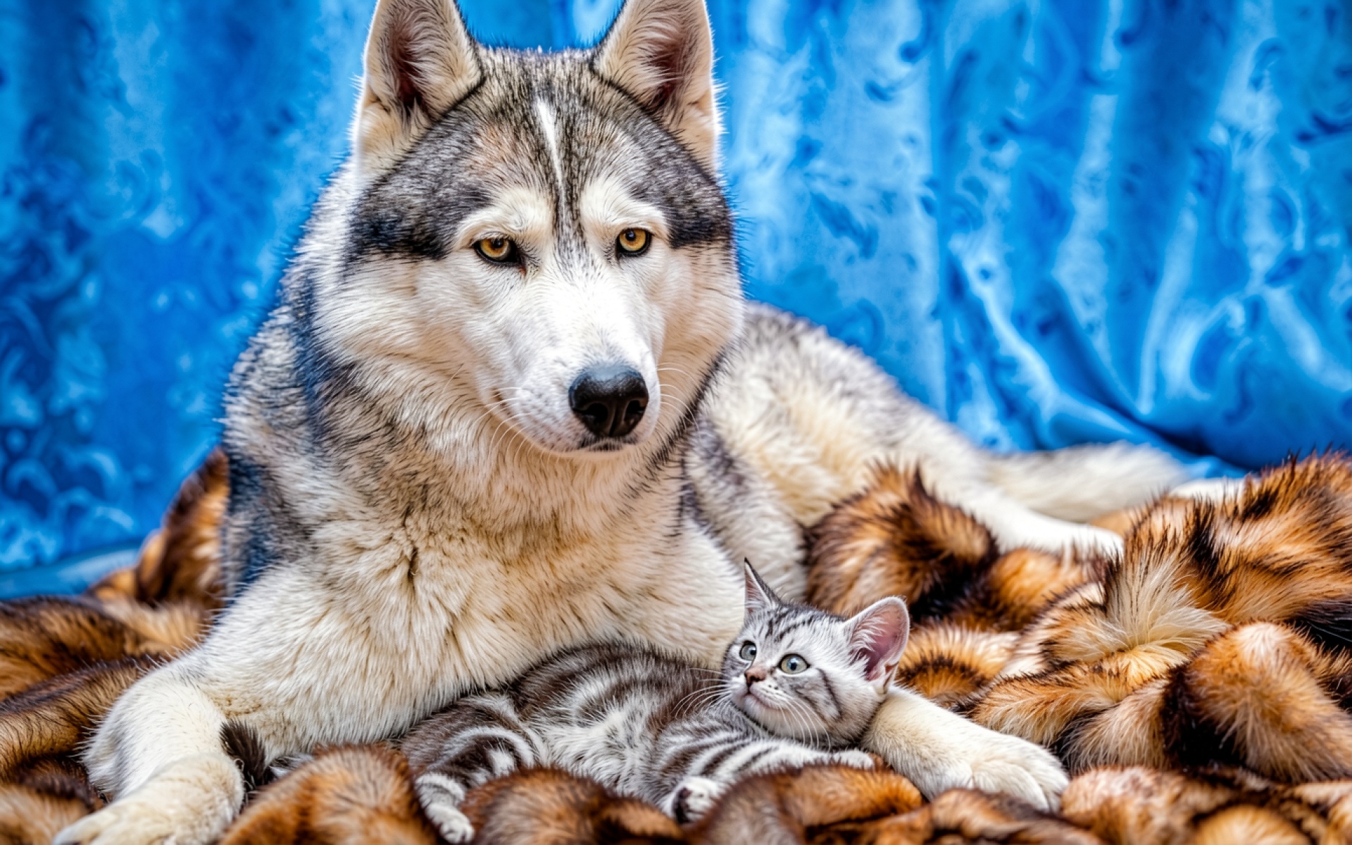 Хаски и котенок на коричневом меху синий фон