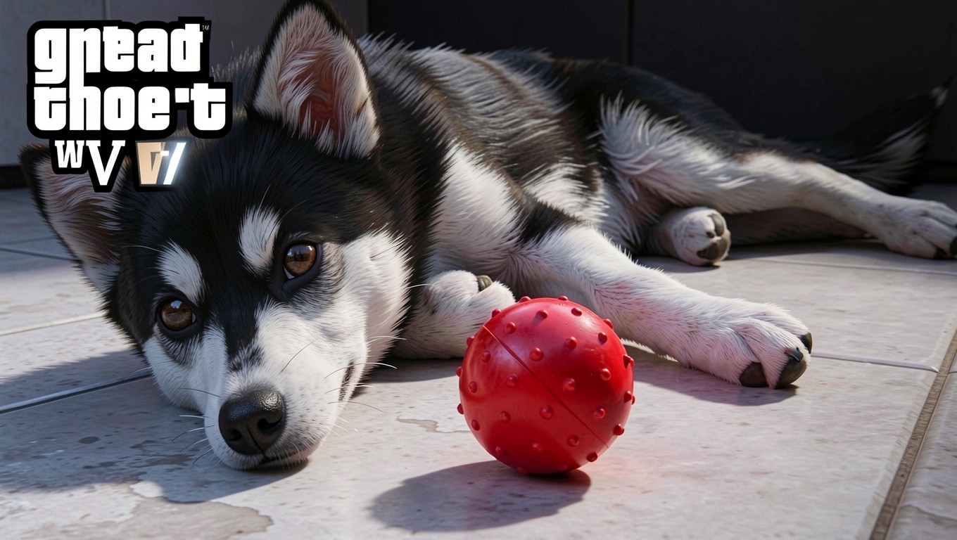 Щенок хаски с красным мячом на террасе
