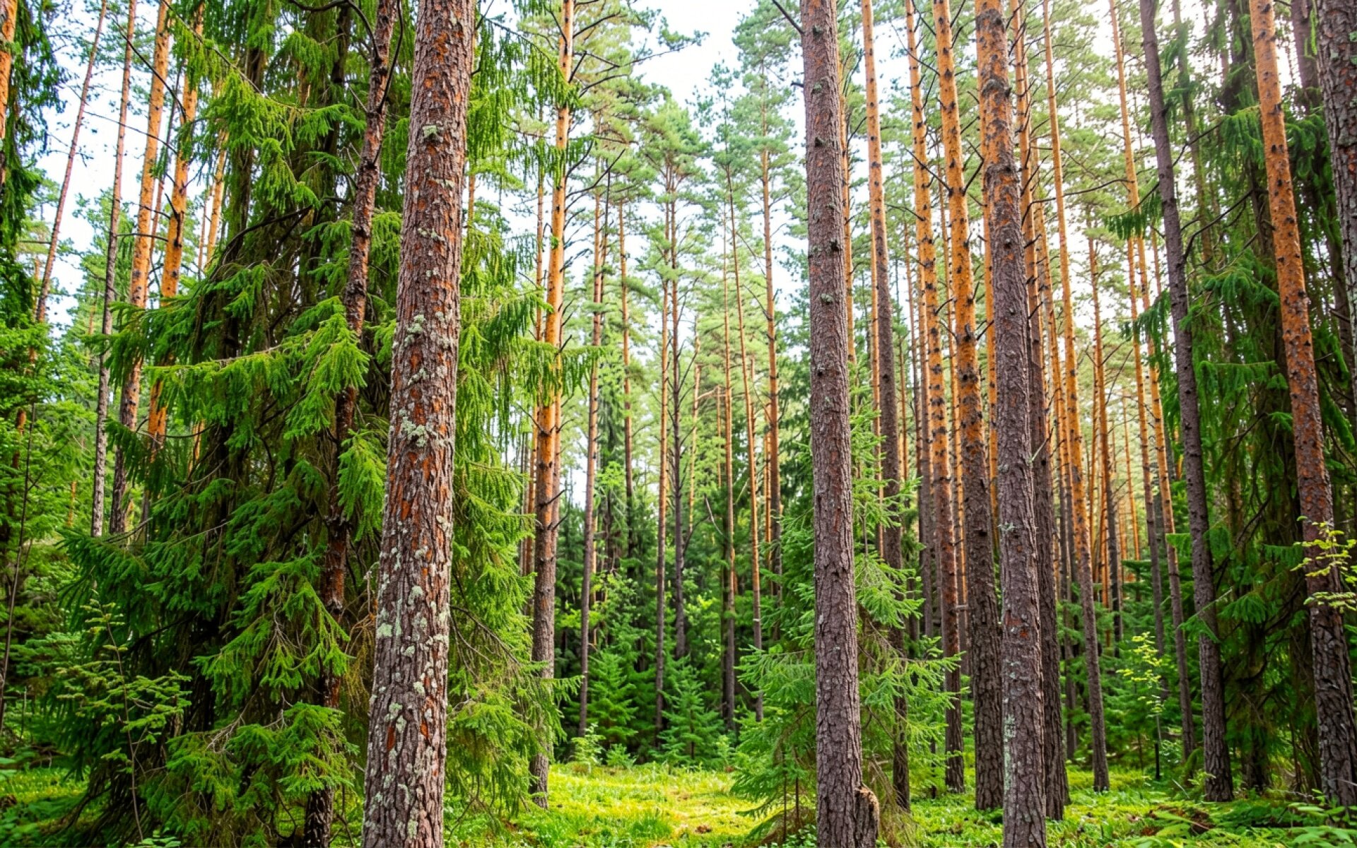 Хвойный лес с высокими соснами днем