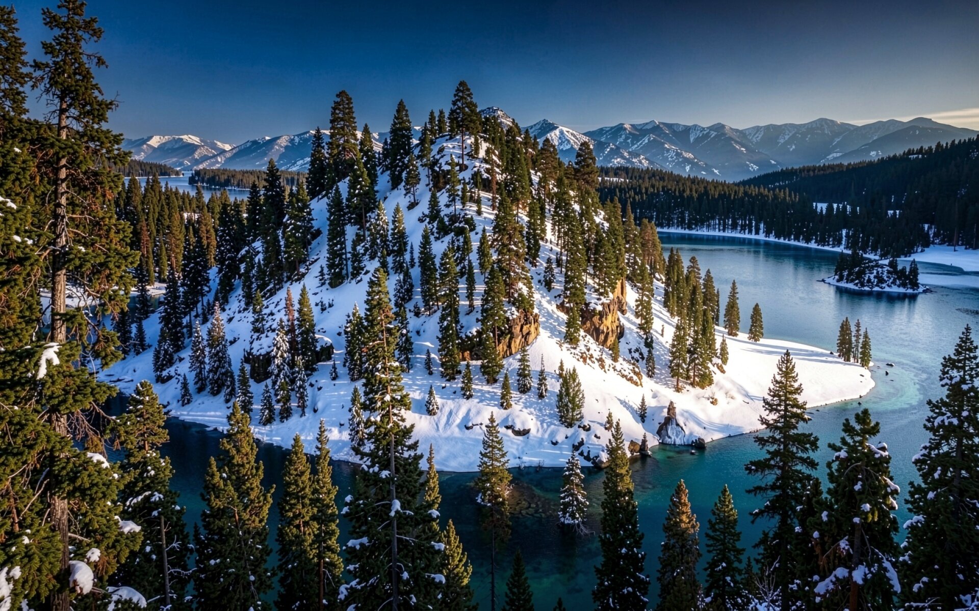 Зимний пейзаж заснеженного острова с хвойными деревьями