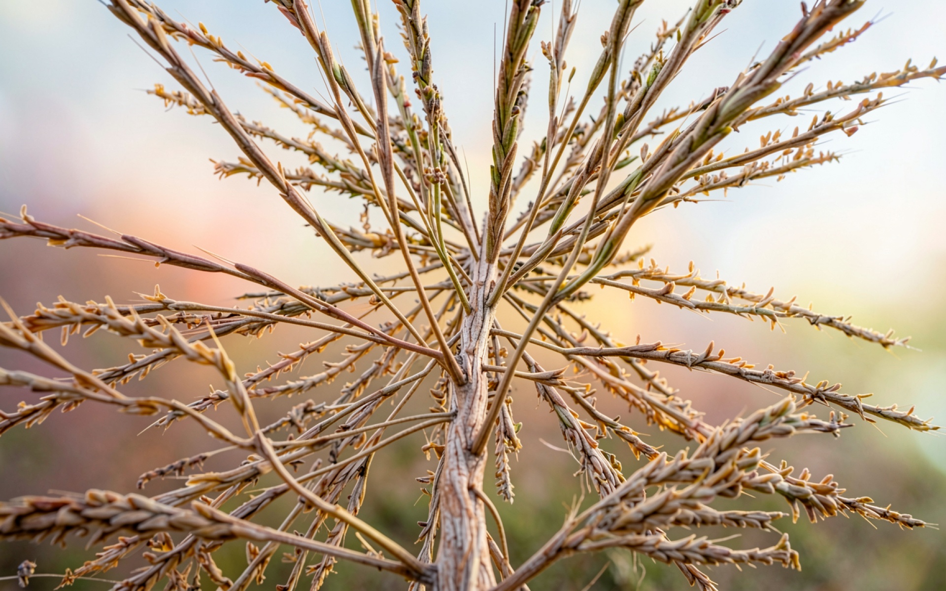 Сухой колос пшеницы золотистого цвета на закате