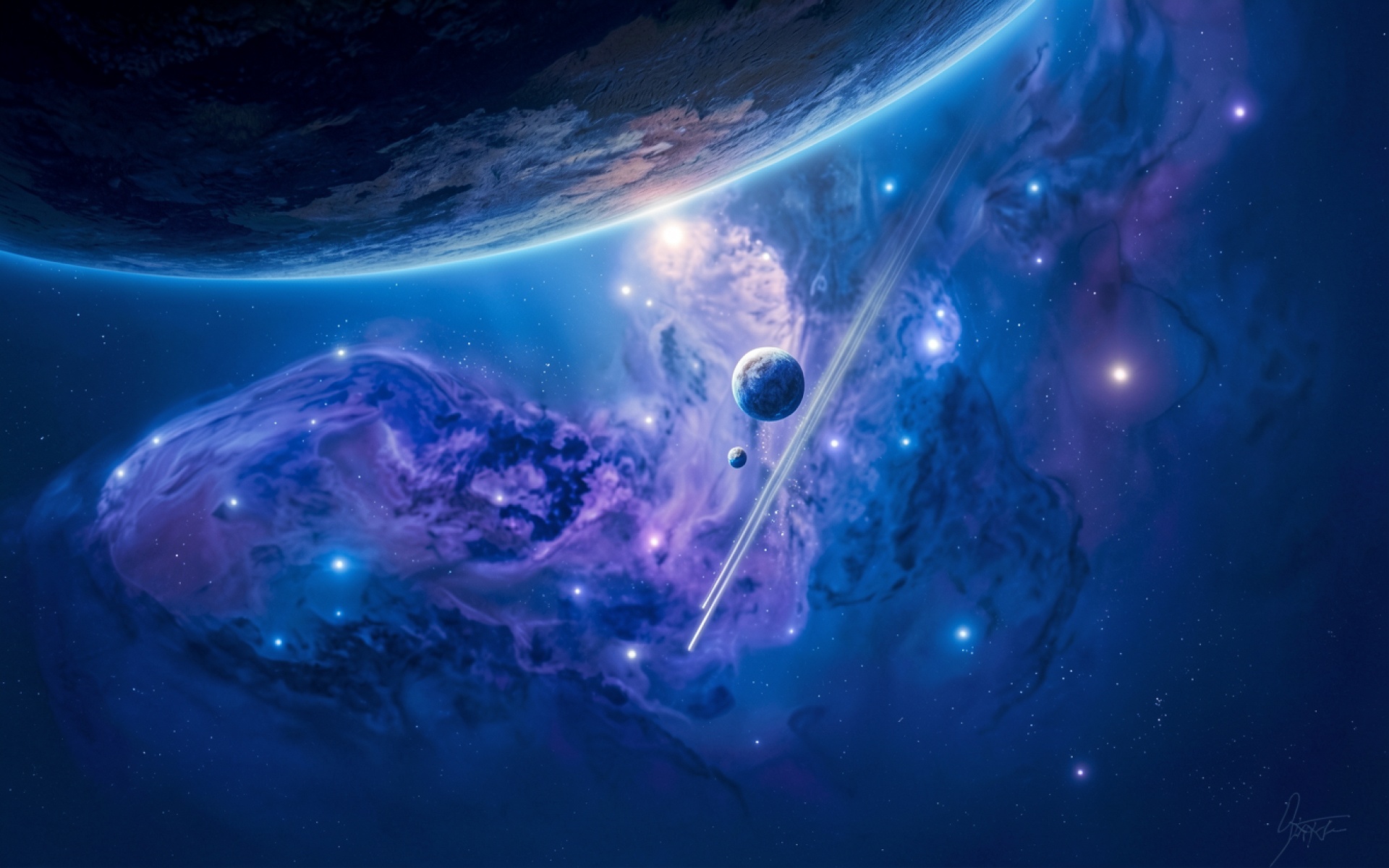 Космическая туманность синего цвета с планетами
