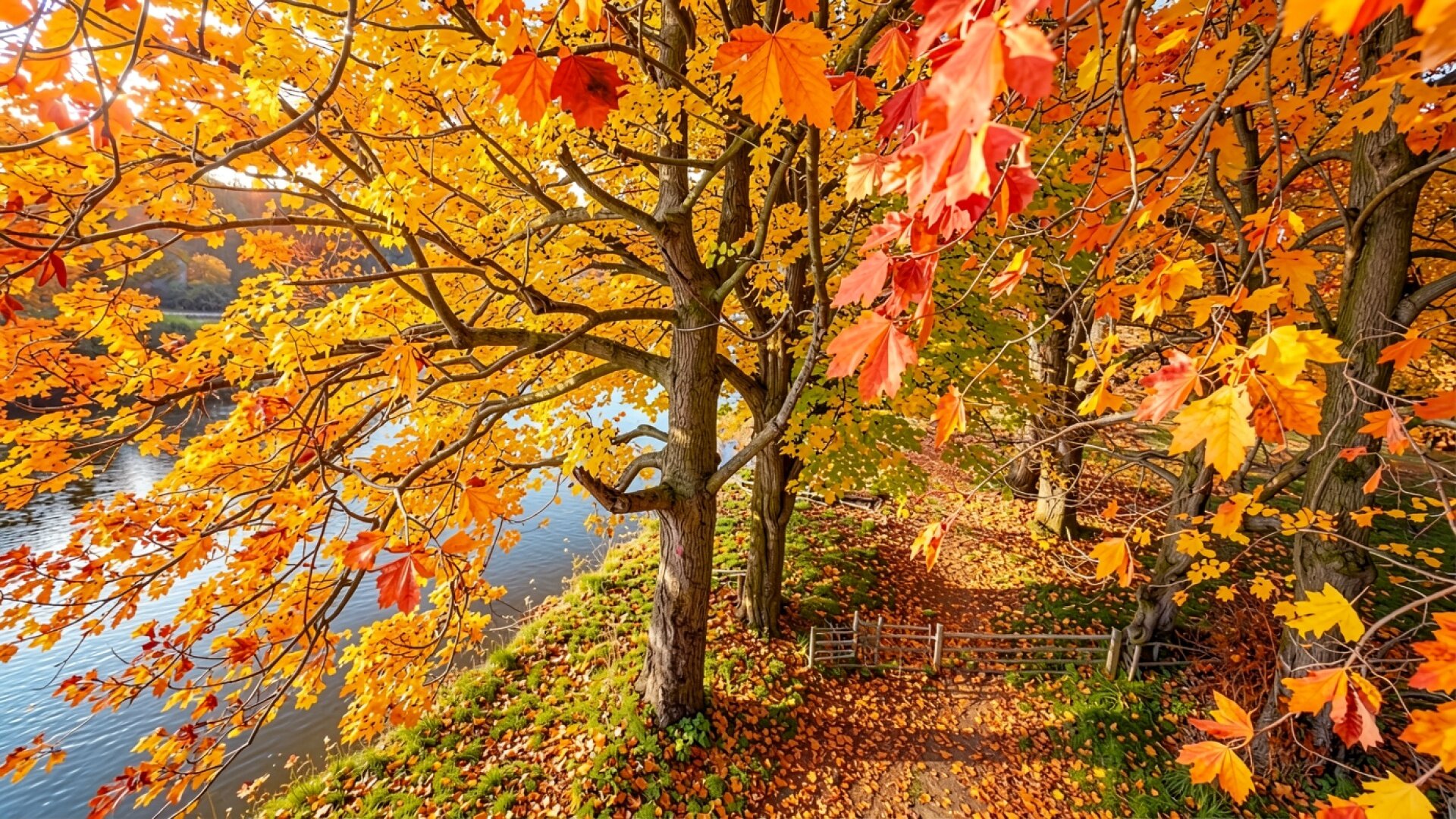 Осенние клены золотого цвета у реки