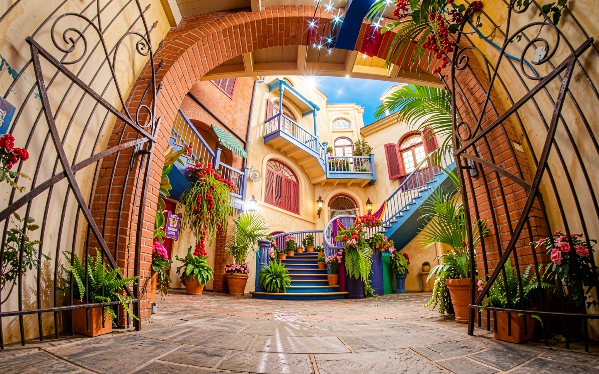 Уютный внутренний дворик с цветами и аркой