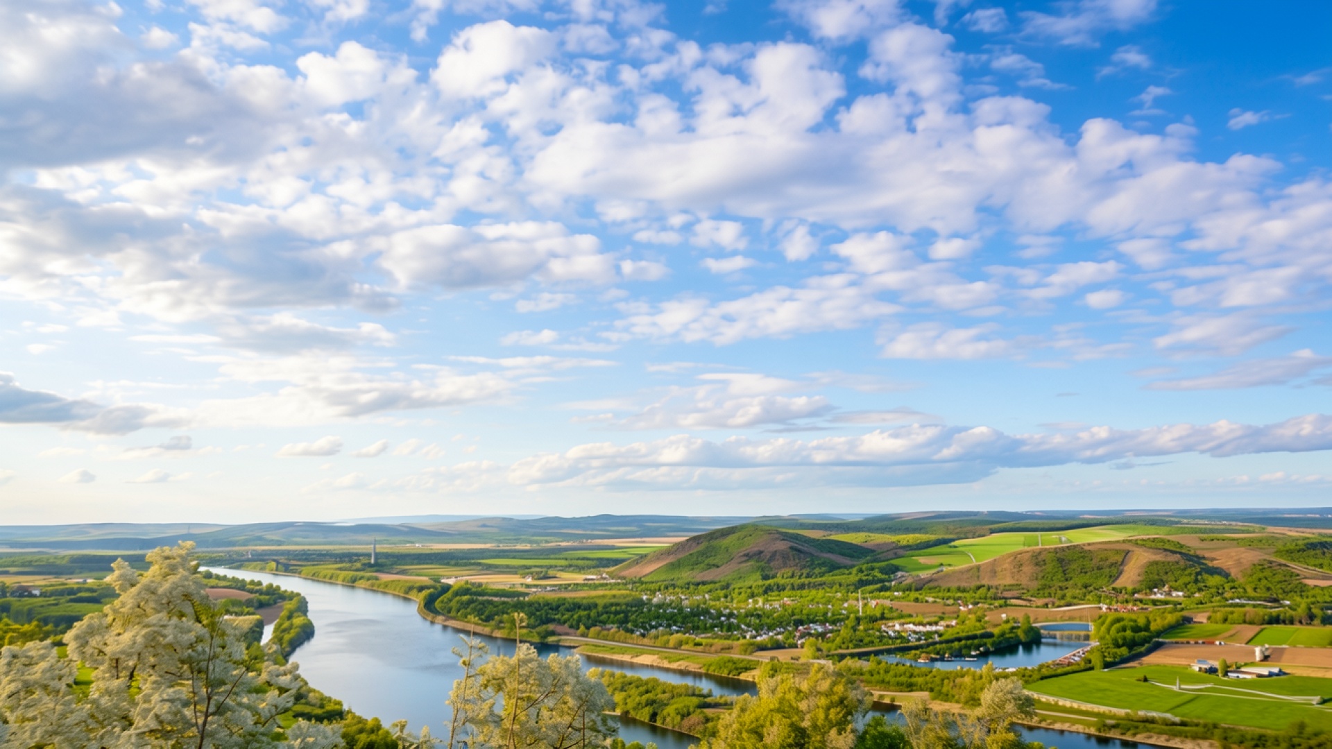 Панорама реки в долине с белыми цветами