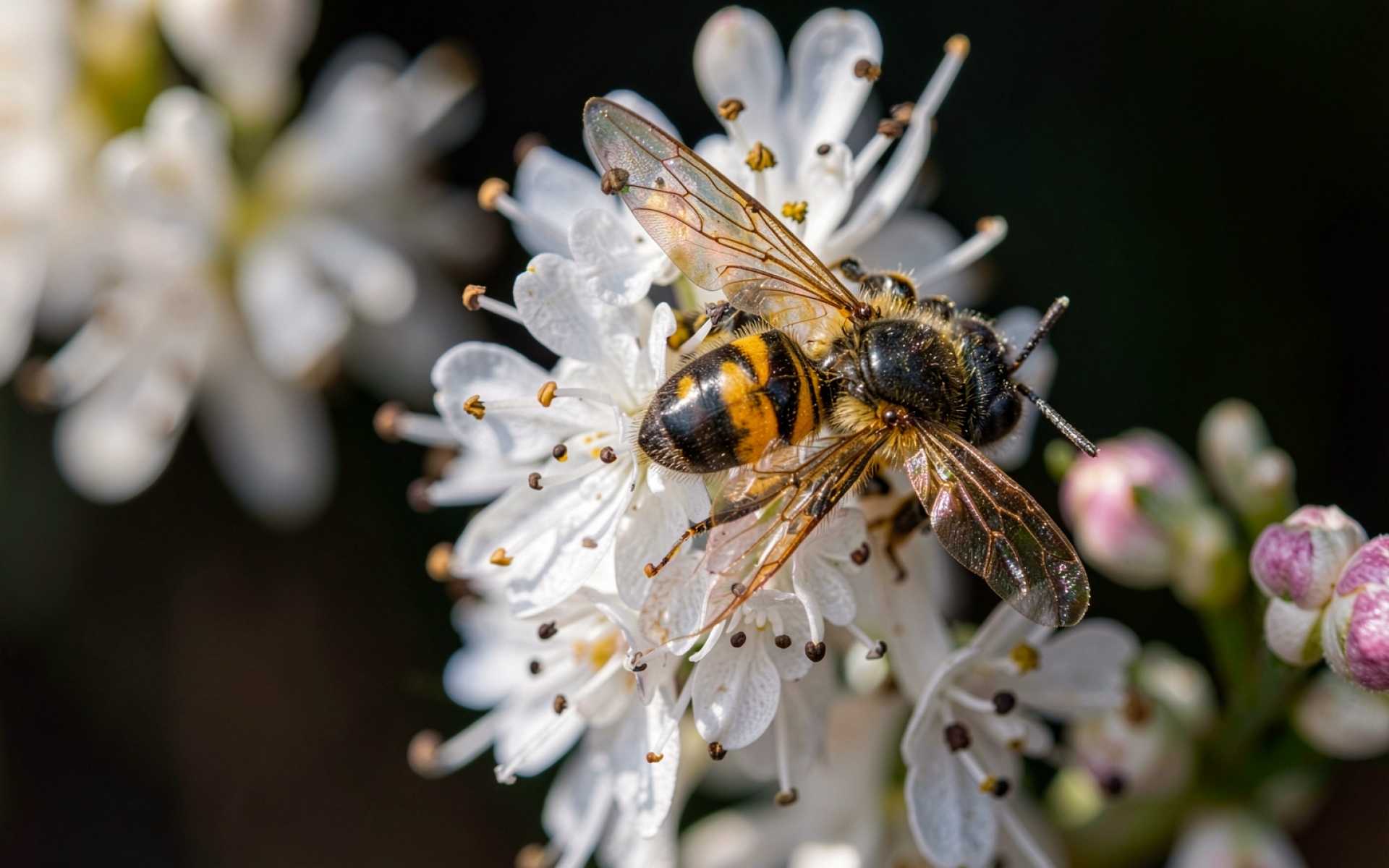 Медоносная пчела на белых цветах весной