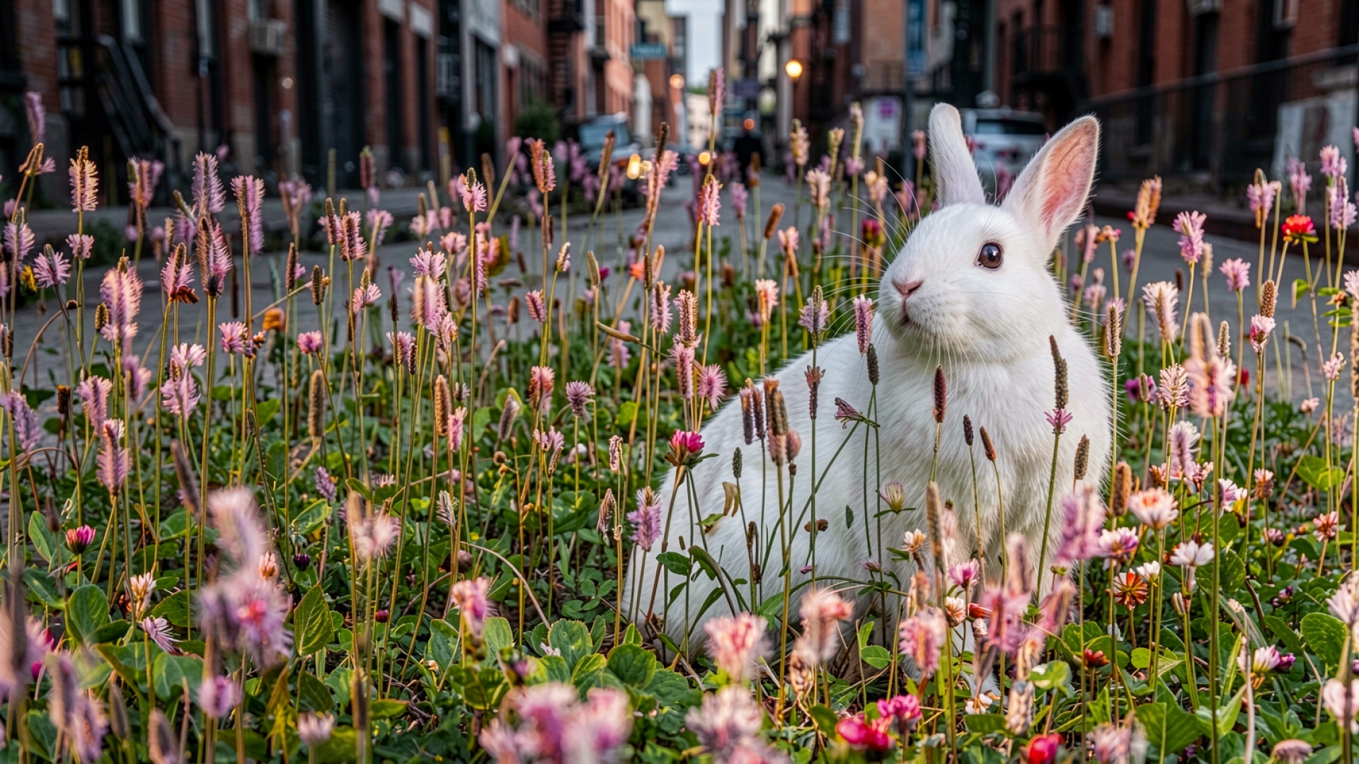 Белый кролик в розовых цветах города
