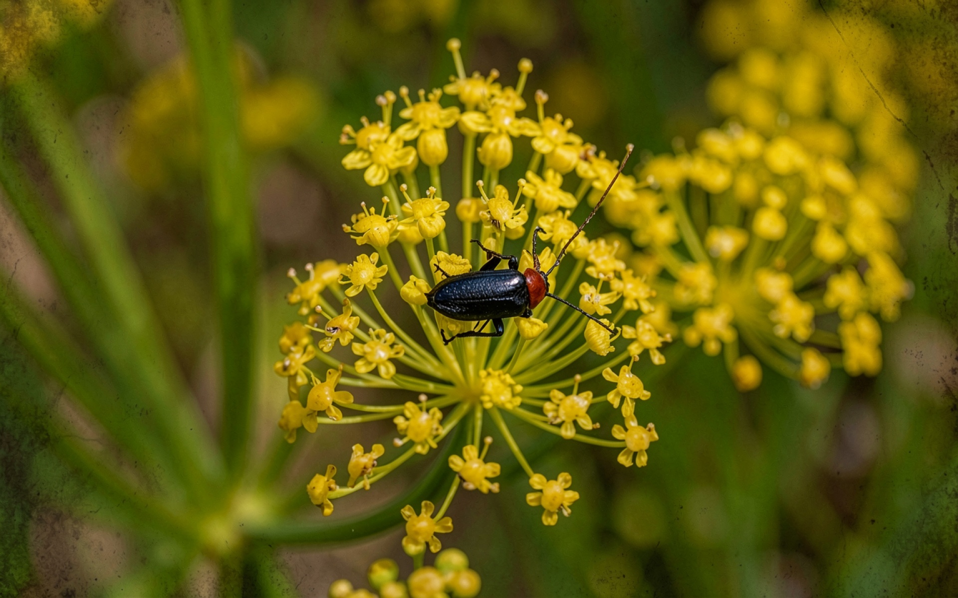 Черный жук на желтых цветах зонтичника