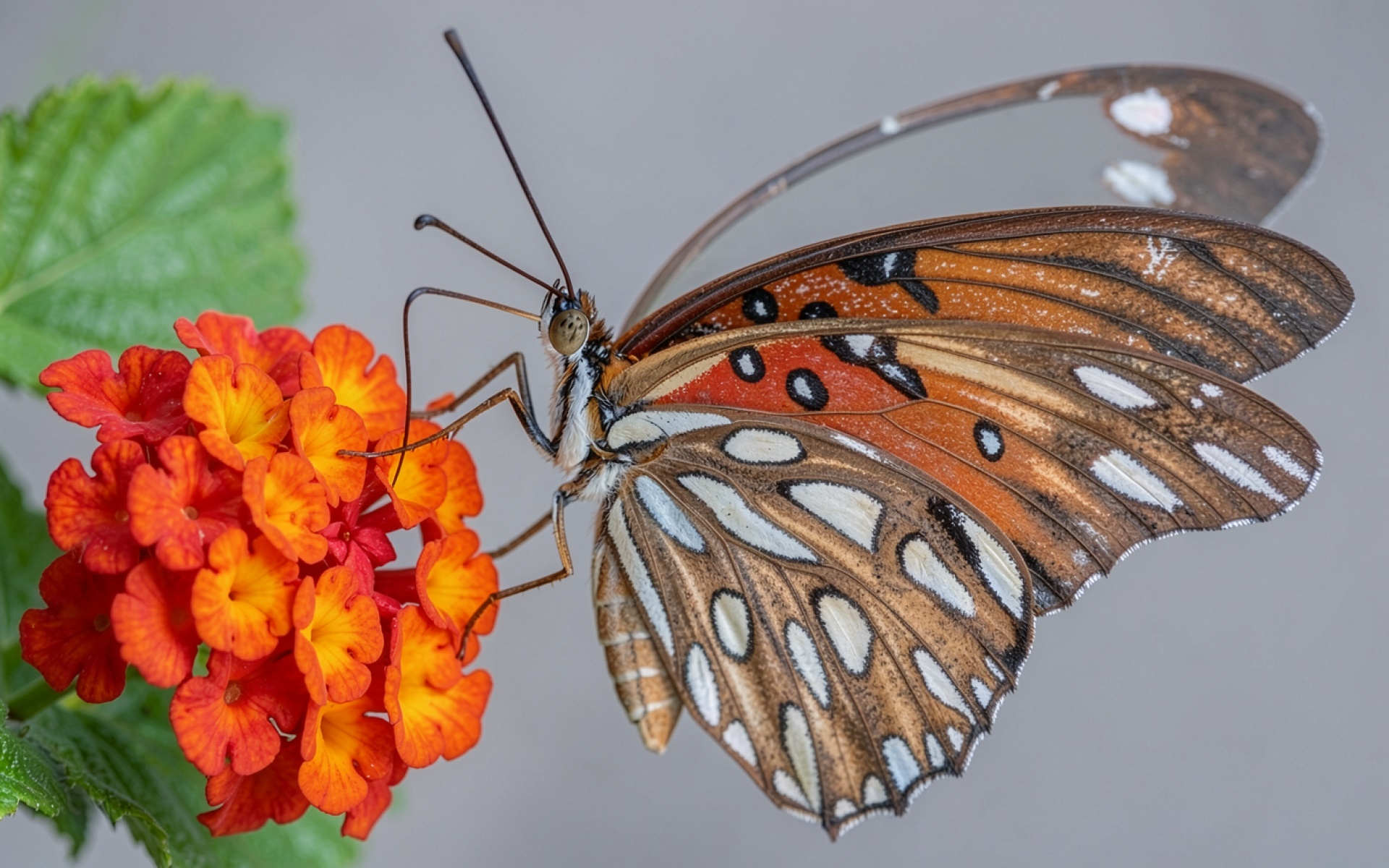 Оранжевая бабочка на красных цветах лантаны