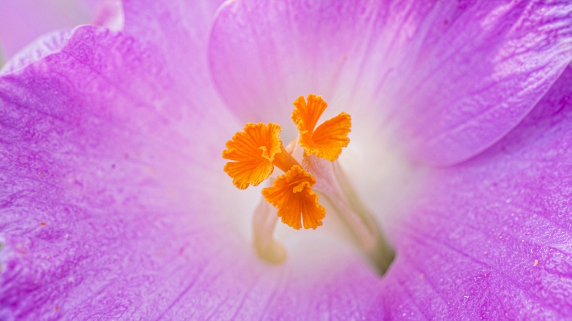 Макросъемка фиолетового цветка с оранжевыми тычинками
