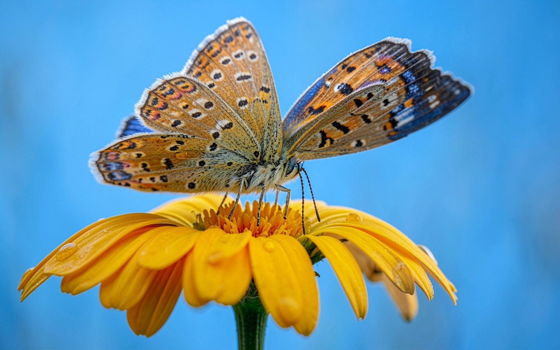 Оранжевая бабочка на желтом цветке голубой фон