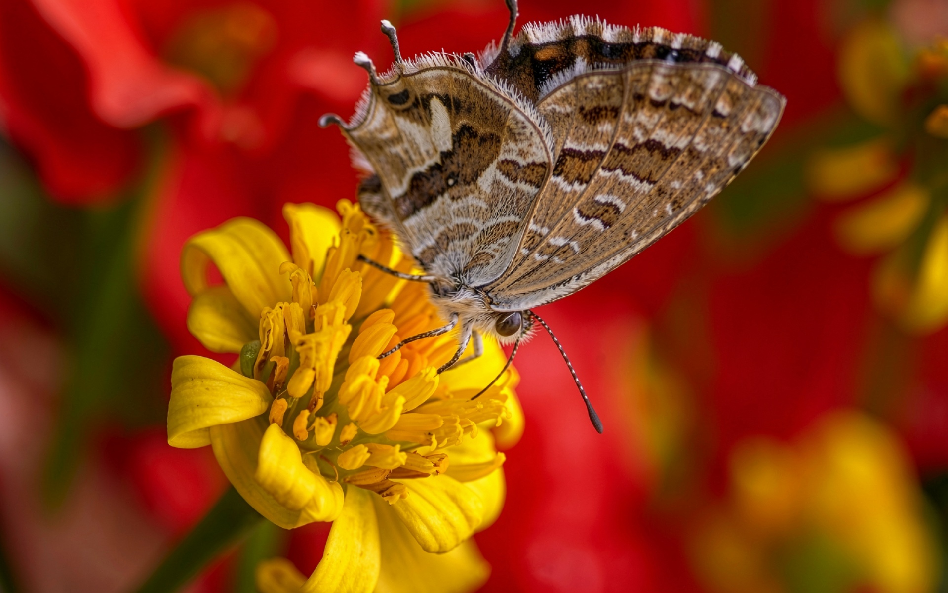 Бабочка на желтом цветке красный фон