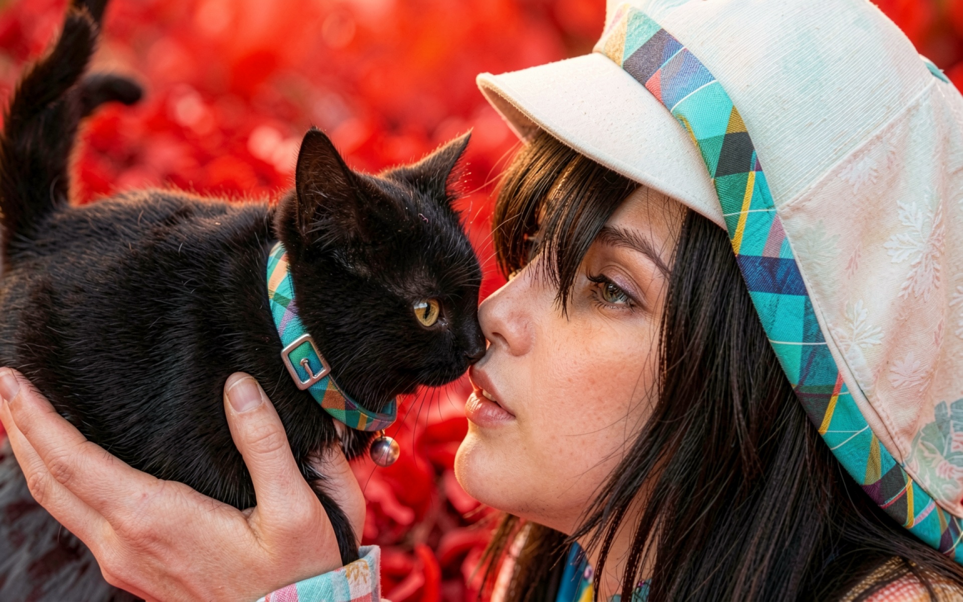 Черный кот и девушка в цветной шляпе
