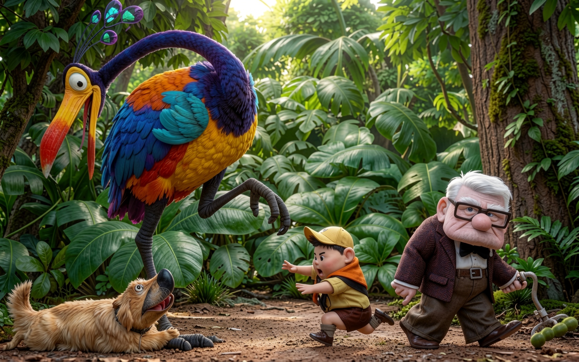 Цветной журавль с мальчиком и мужчиной в джунглях