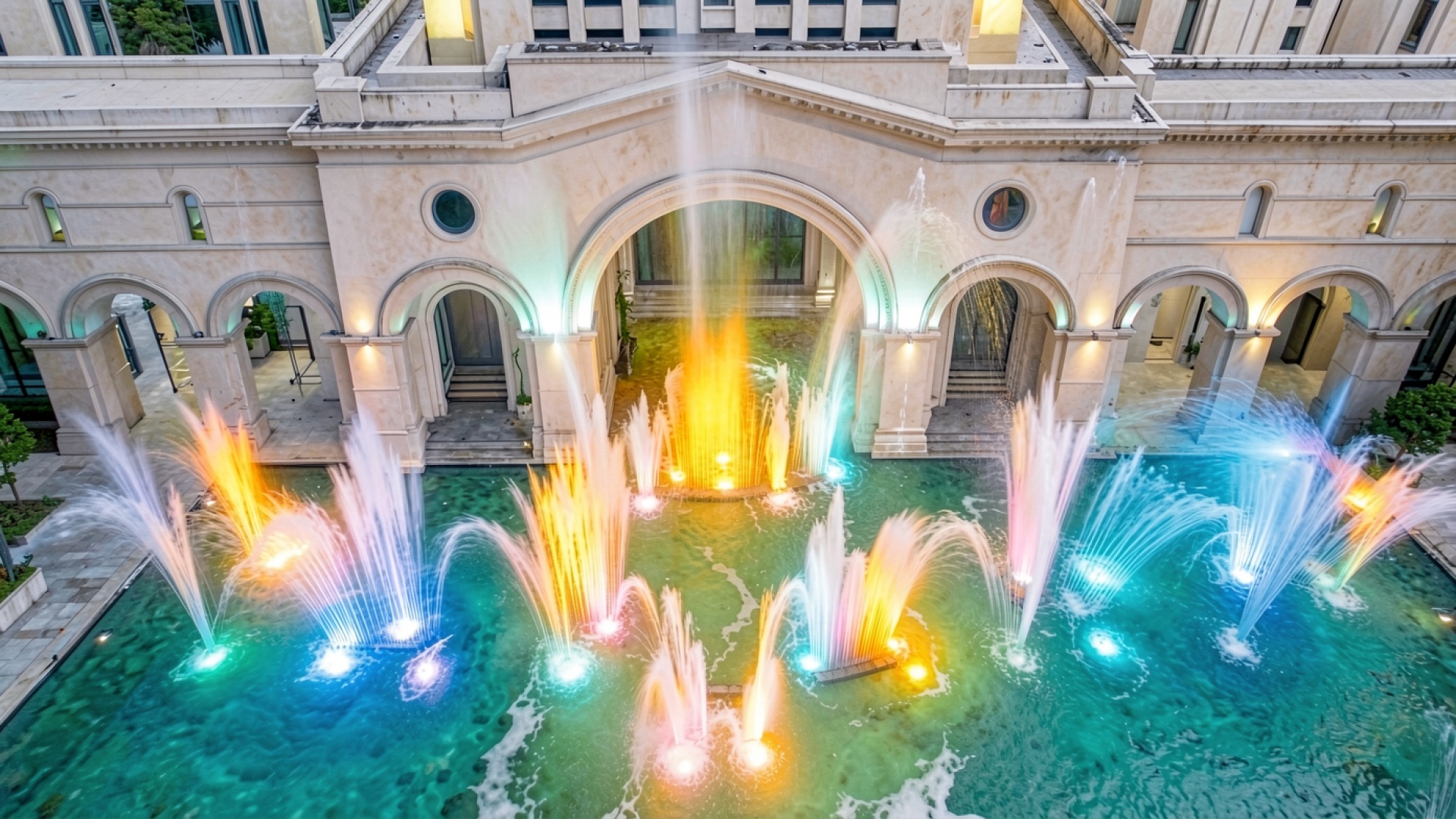 Цветные фонтаны в классическом внутреннем дворе
