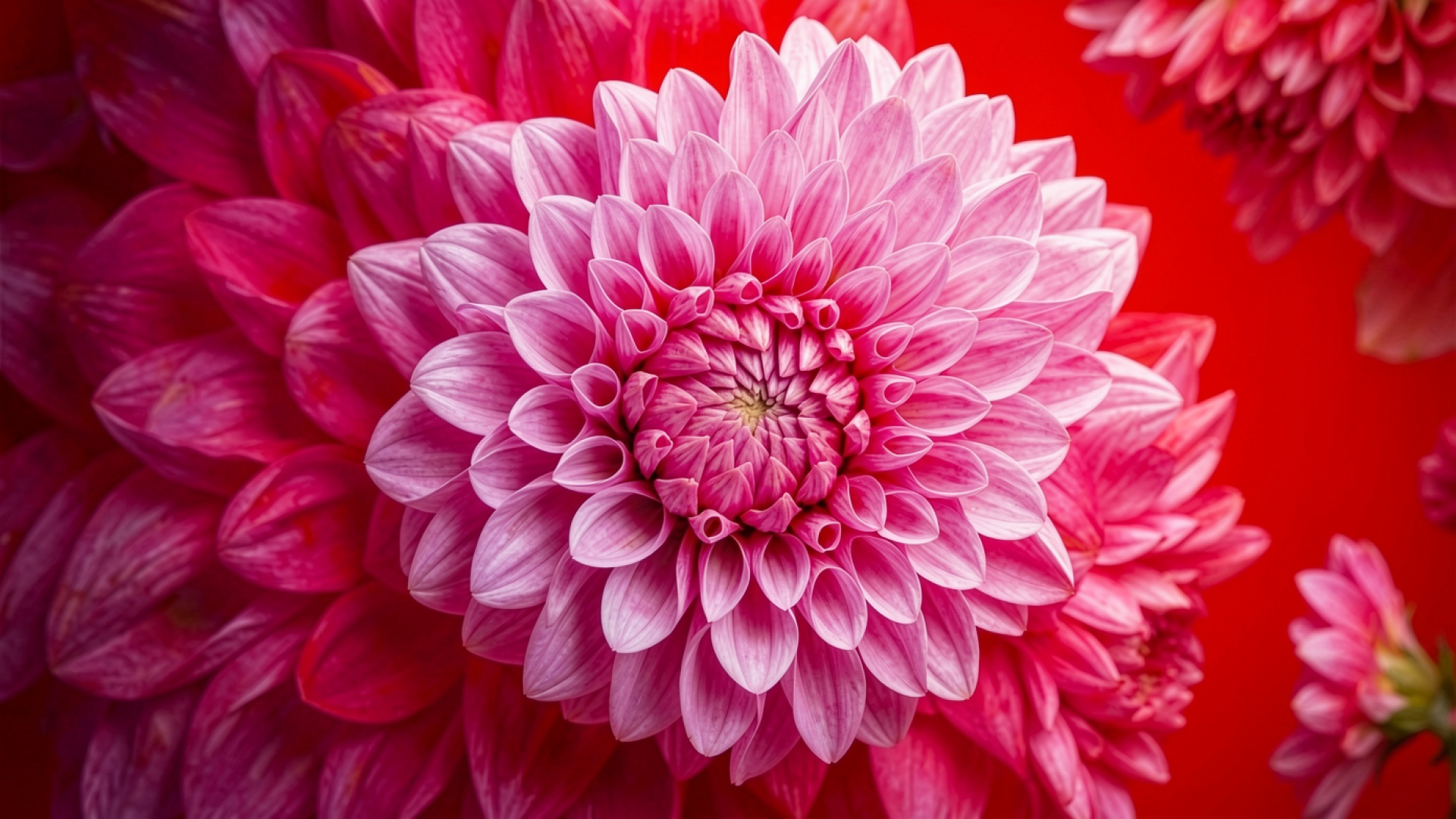 Розовый цветок георгин на красном фоне