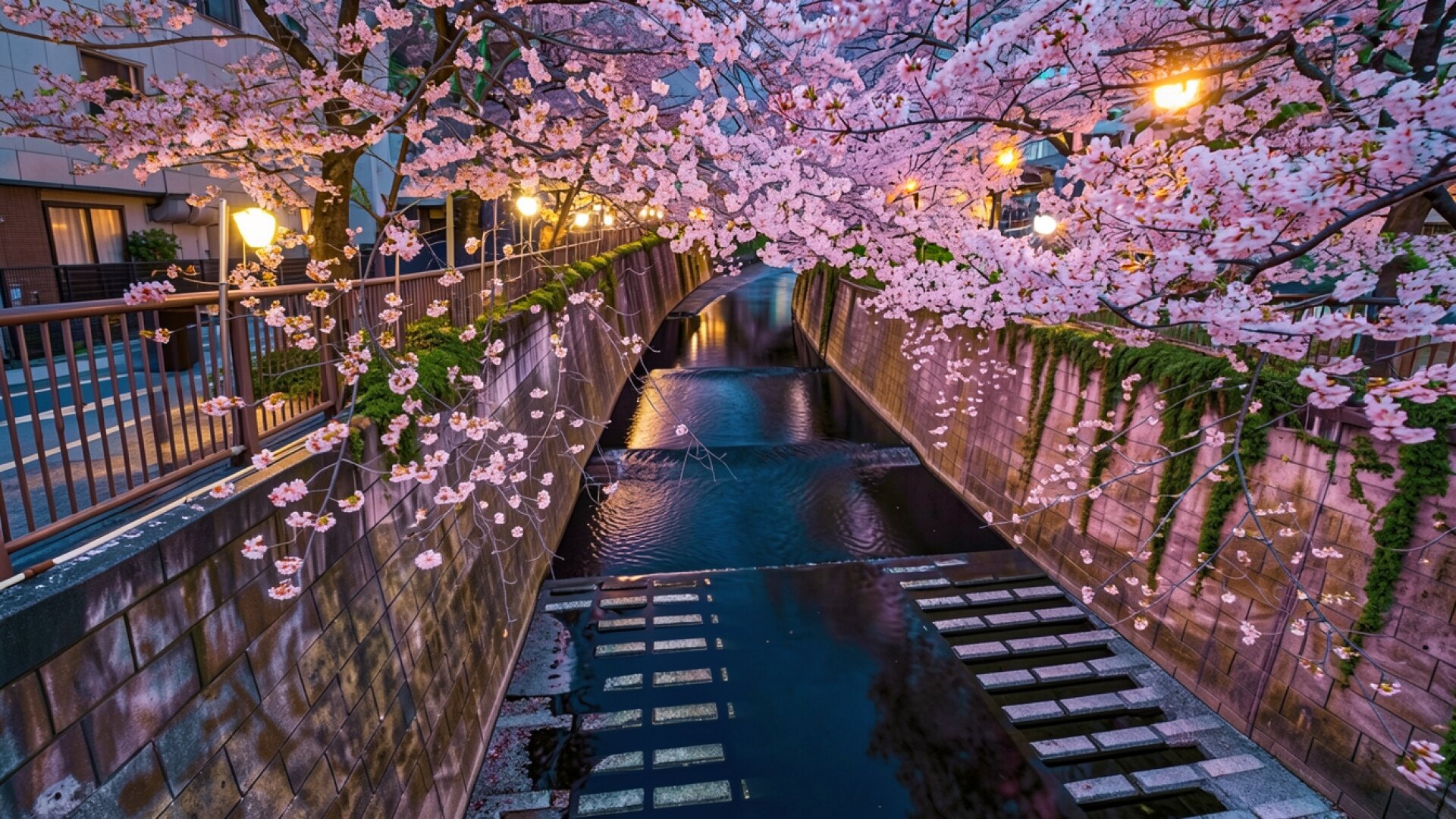 Цветущая сакура над узким городским каналом