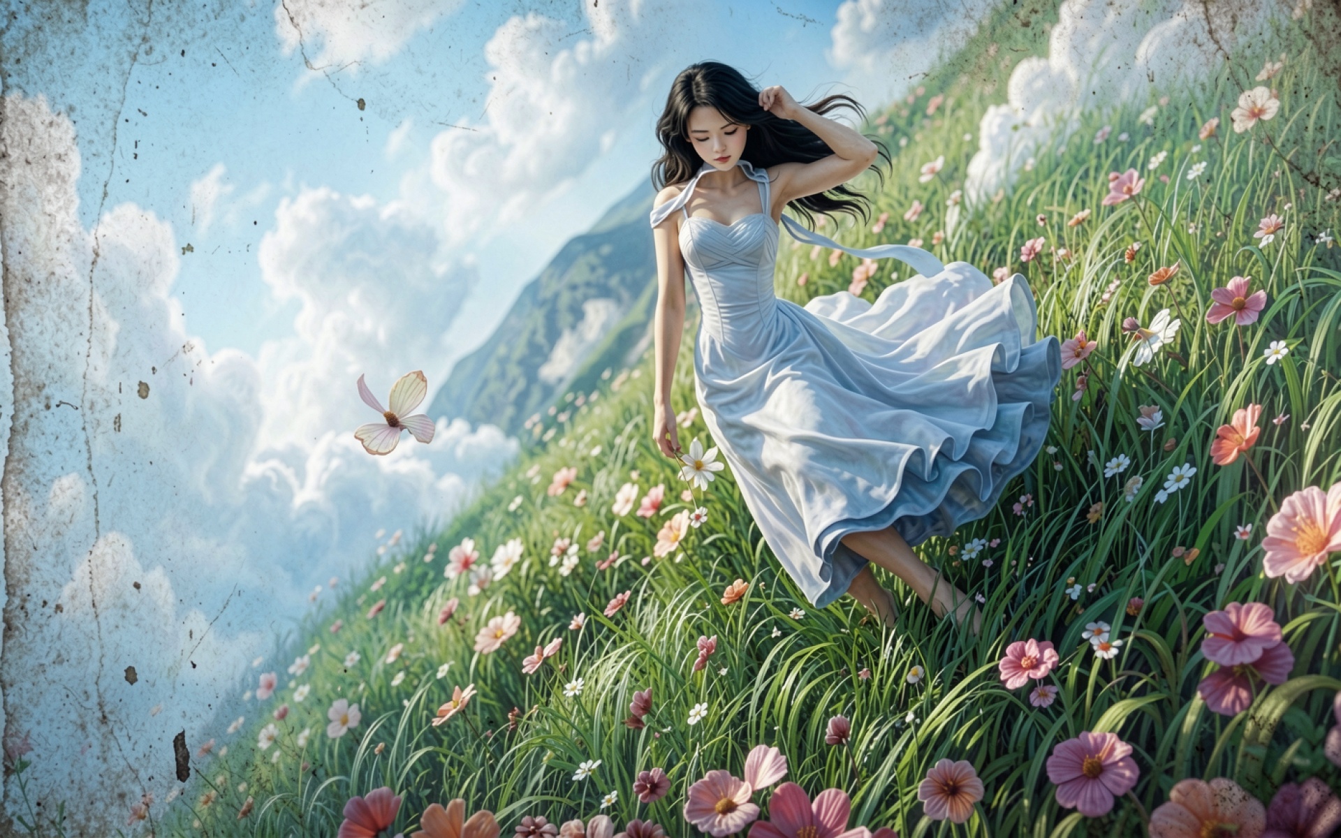Девушка в белом платье в цветущем лугу