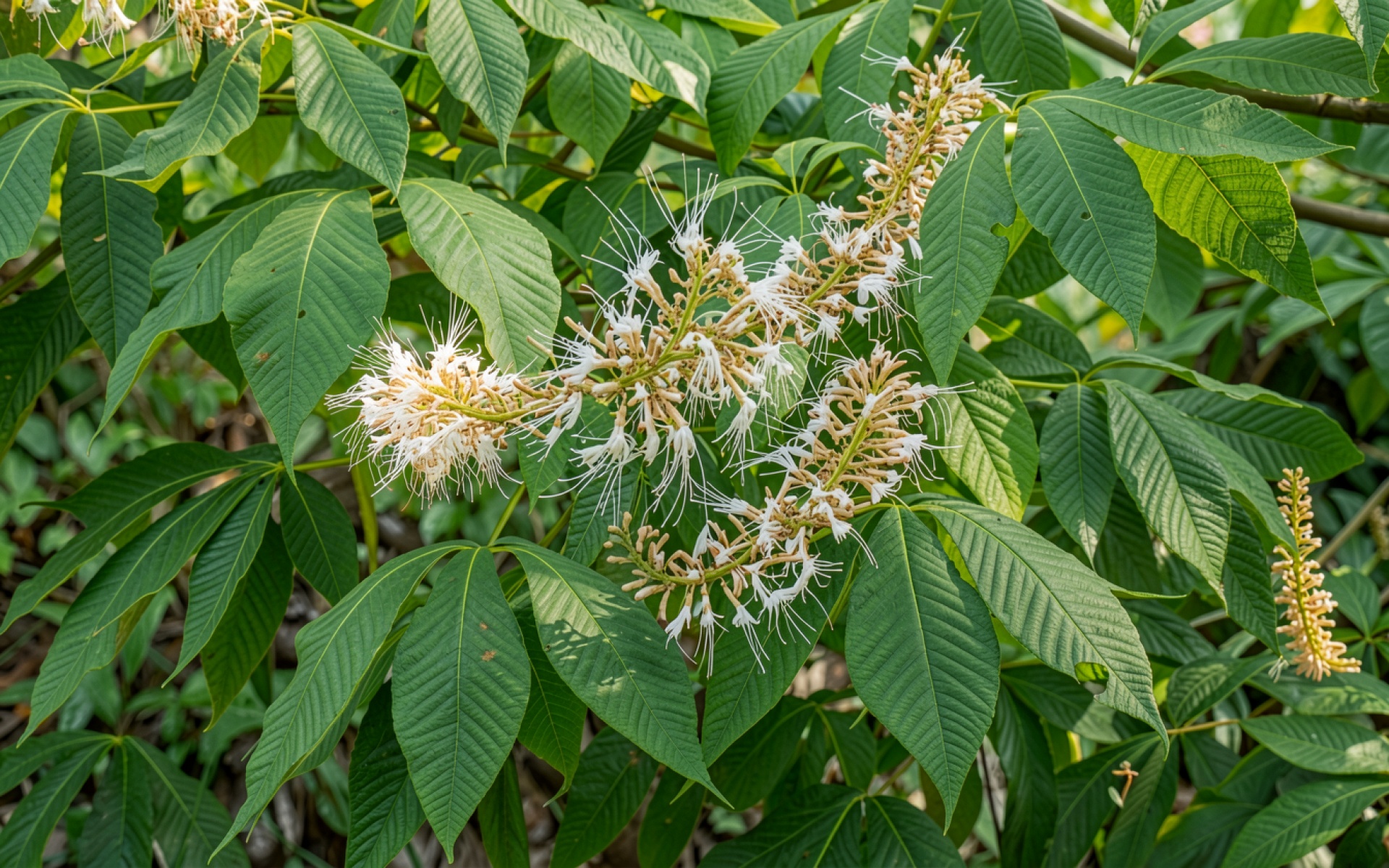 Белые цветы каштана среди зеленых листьев
