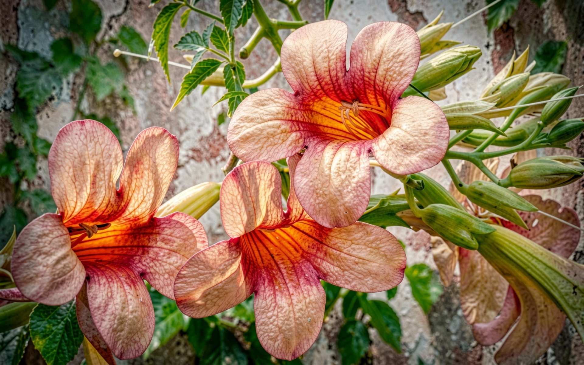 Цветы текомы коралловые на фоне стены