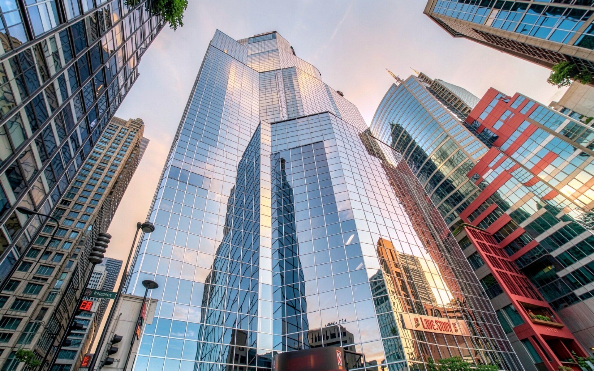 Стеклянные небоскребы в центре города при закате