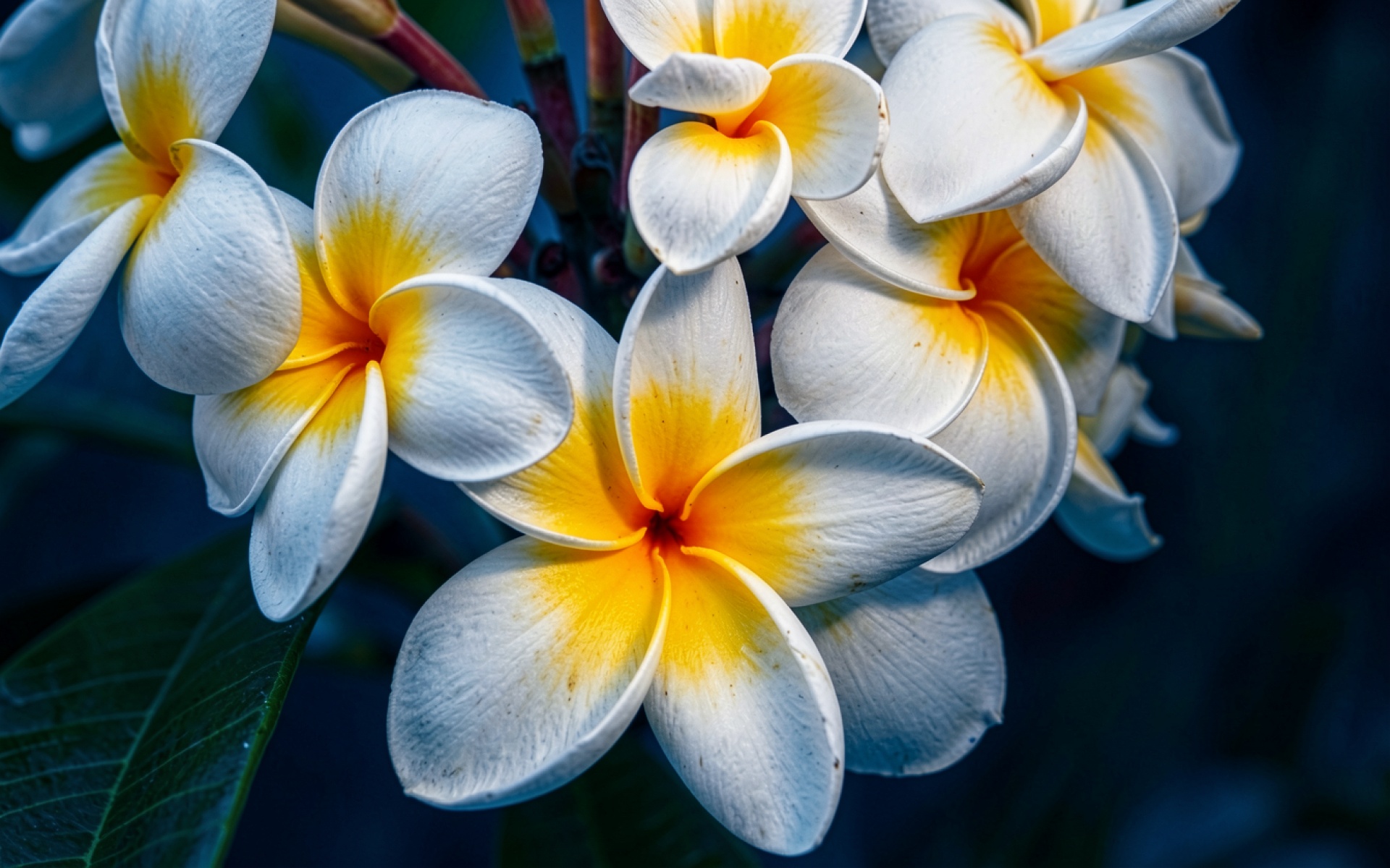 Белые цветы плюмерии с желтым центром