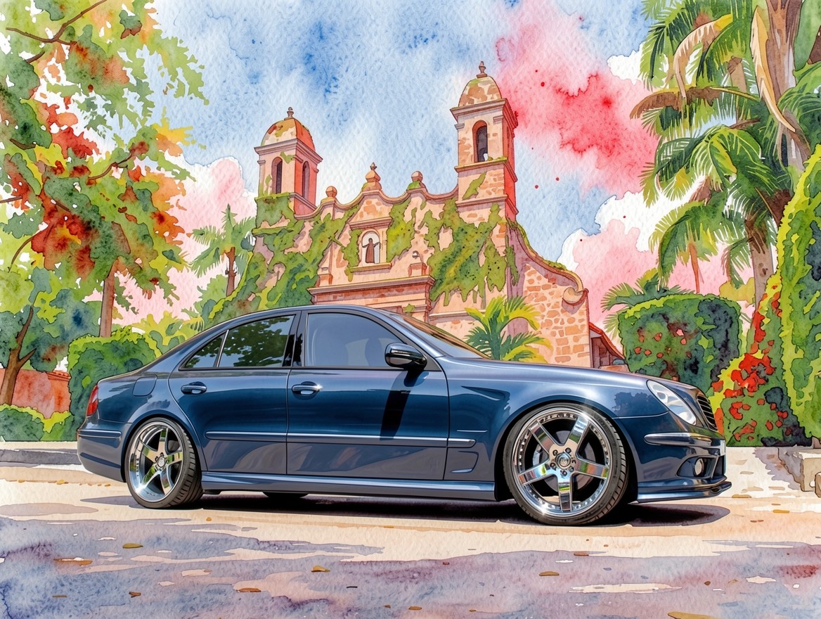 Синий седан Mercedes на фоне старой церкви