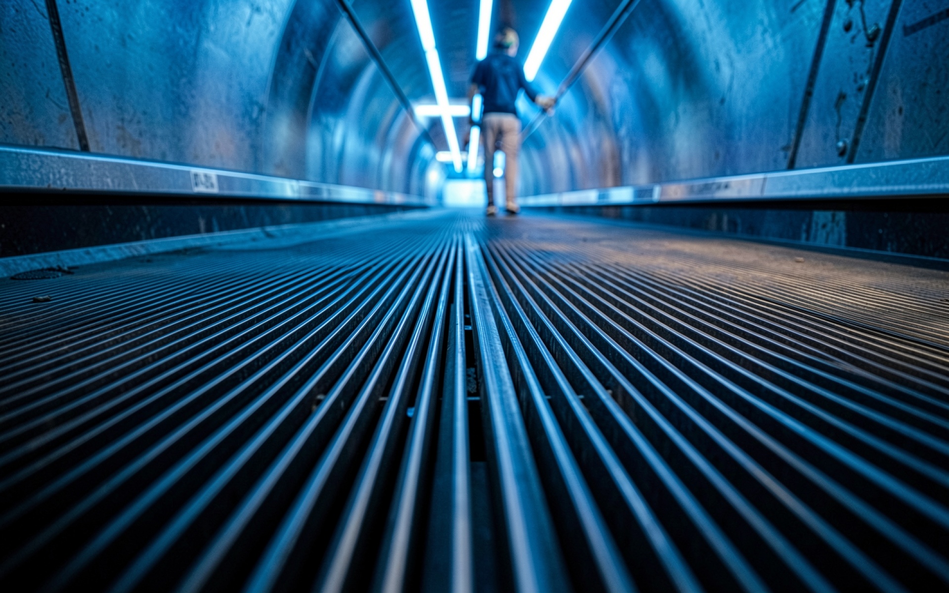 Человек в синем тоннеле с металлическим полом