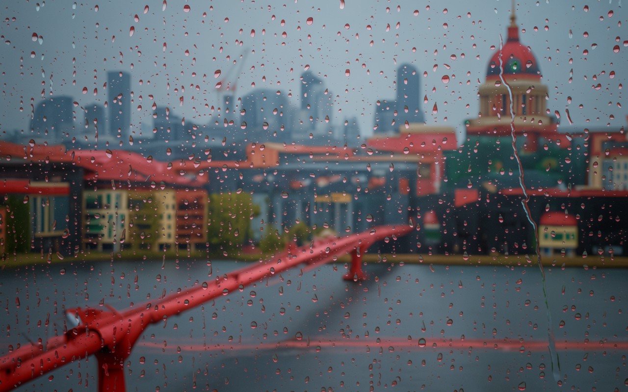 Городской пейзаж с красным куполом через стекло