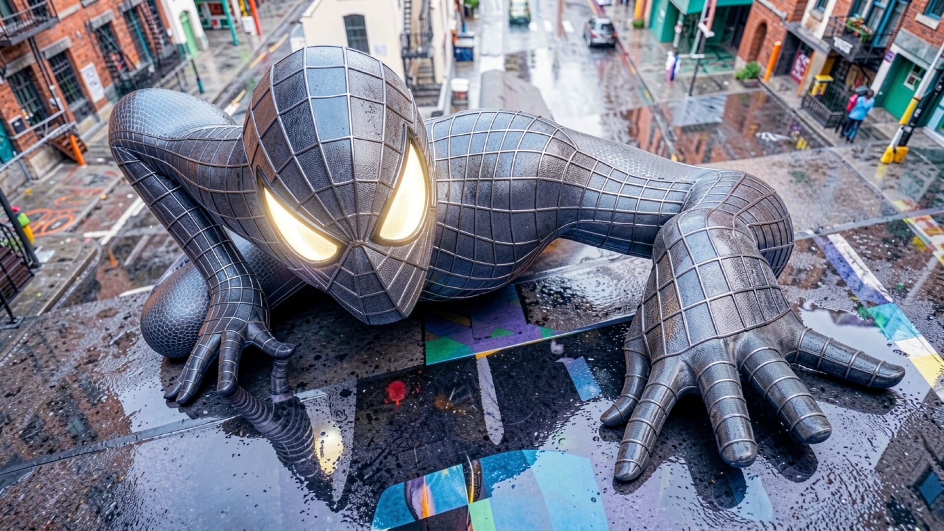 Черный Человек-паук на мокрой крыше города