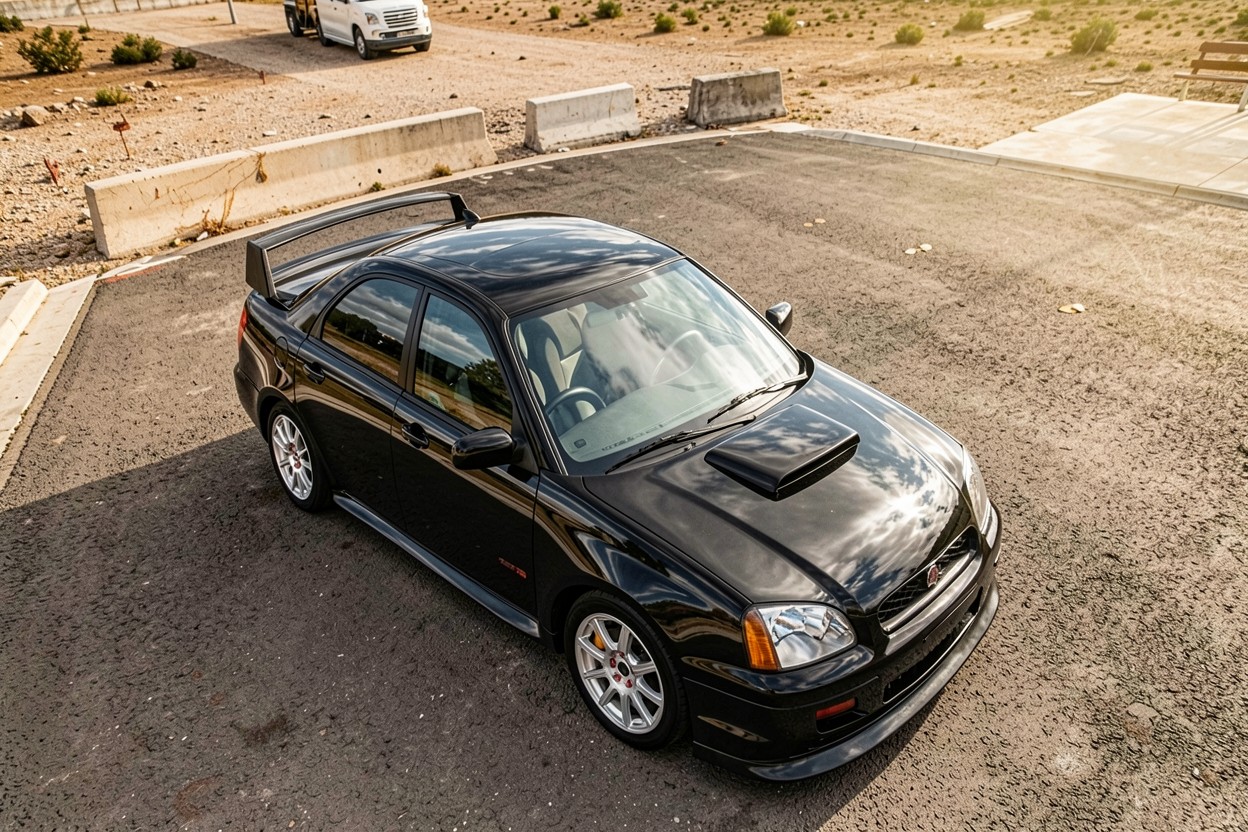 Черный автомобиль Subaru Impreza на пустынной дороге